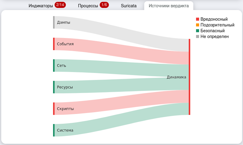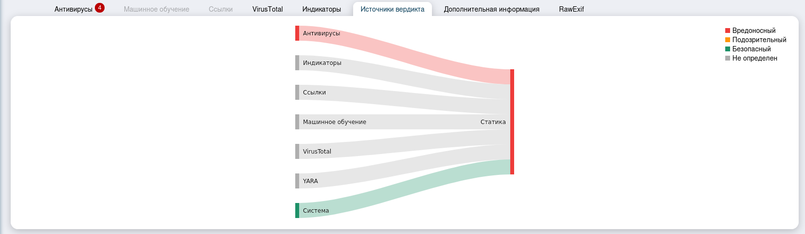Во вкладке «Источники вердикта» можно ознакомиться с тем, какие источники посчитали файл вредоносным.