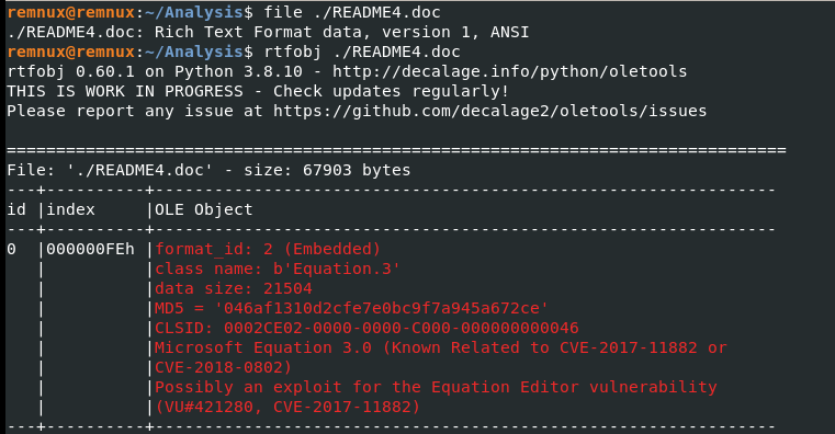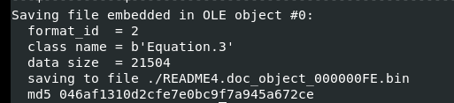 В файле содержится объект, который использует редактор уравнений «Equation3», в актуальных версиях MS Word его удалили из-за проблем с безопасностью. Одна из которых – эксплуатация уязвимости CVE-2017-11882, где при помощи переполнения буфера в памяти позволяет выполнять наборы вредоносных инструкций. Извлечем полезную нагрузку из исследуемого файла.