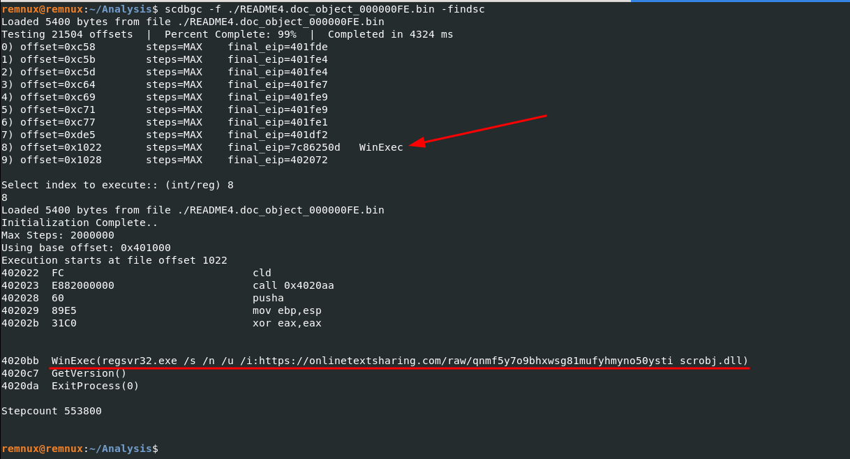 В качестве полезной нагрузки выполняются инструкции вызова утилиты командной строки regsvr32, которая запускает сторонние команды при помощи dll-библиотеки.