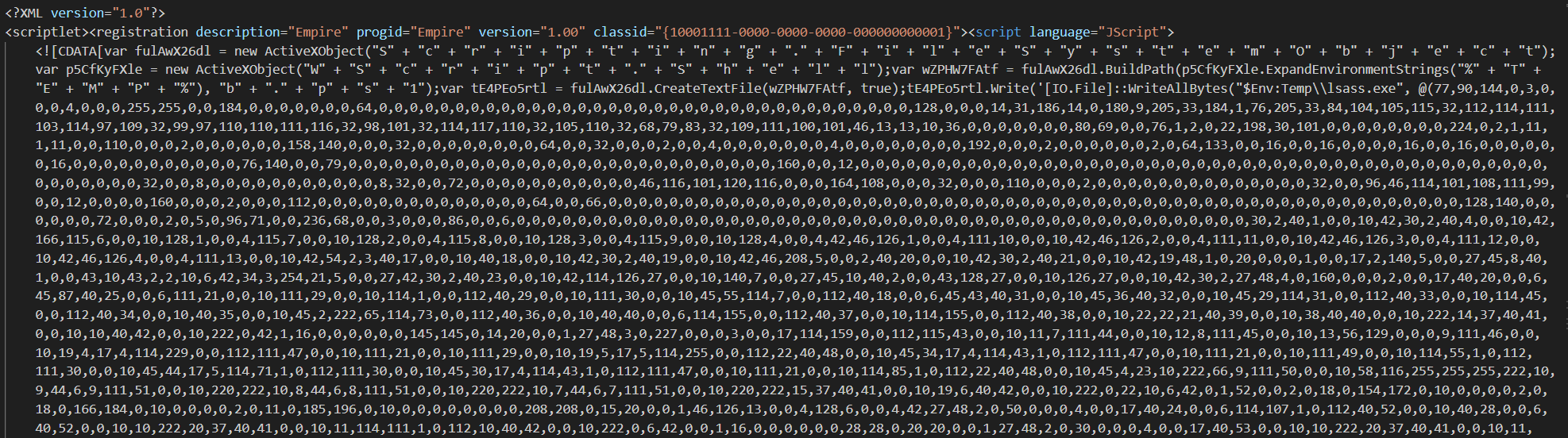 Файл вызывает функцию «WinExec» из библиотеки Winbase и передается аргументом в командную строку. При помощи команды regsvr.exe запрашивается удаленный набор инструкций, а библиотека scrobj.dll позволяет выполнить полученные инструкции. Рассмотрим удаленный скрипт: