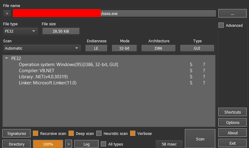 С помощью ПО DIE (Detect It Easy) проанализируем файл %Temp%\lsass.exe..
