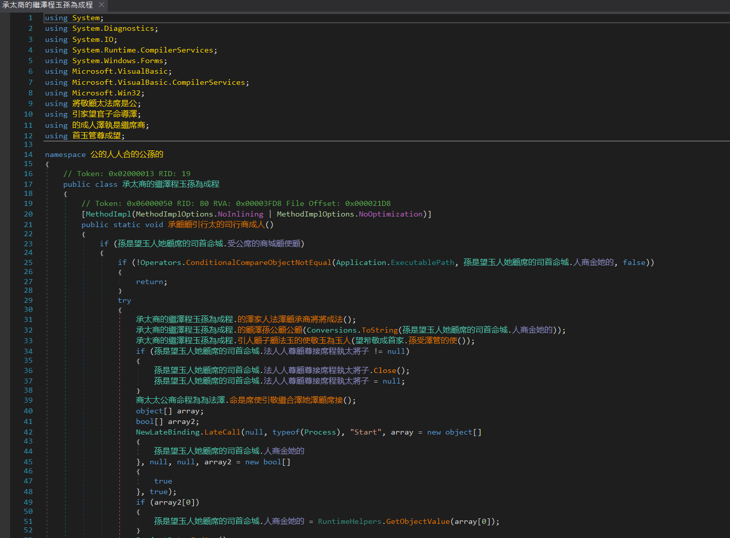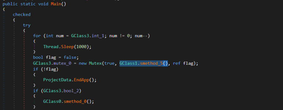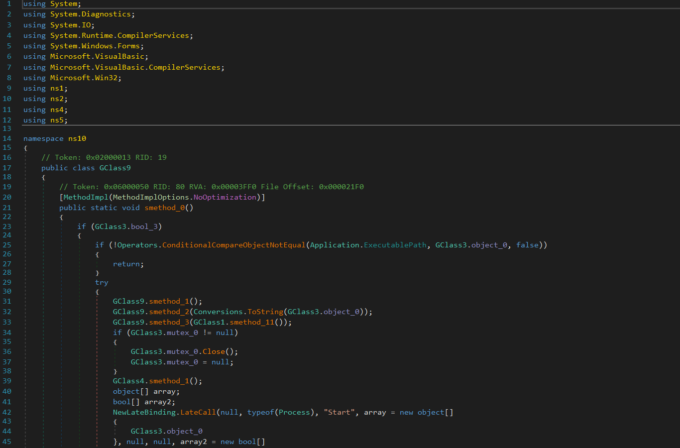 После этого откроем файл в dnSpy и при загрузке видим, что файл обфусцирован.