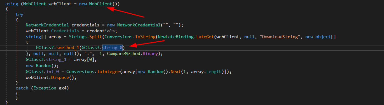 Посмотрим, где используется строка «string_0». В инструкциях содержится класс «WebClient», который может задействоваться для обмена данными при помощи URI. Также строка «string_0» передается в качестве аргумента в функцию «GClass7.smethod_1».