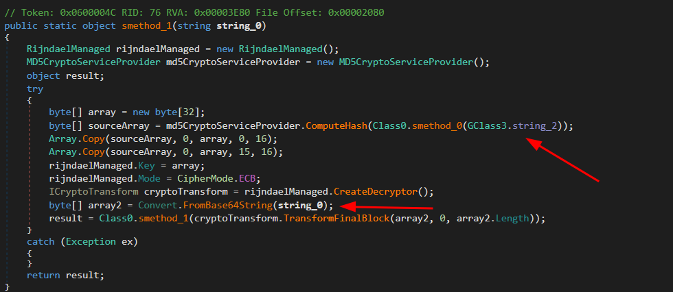 Упадем в функцию «GClass7.smethod_1». Мы можем наблюдать, что создается массив из 32 байтов. Также, задействуется из конфигурационного класса строка «string_2» со значением: «IW4nnaB3Y0urs». Из этого значения рассчитывается хеш MD5 и записывается в переменную «sourceArray».
