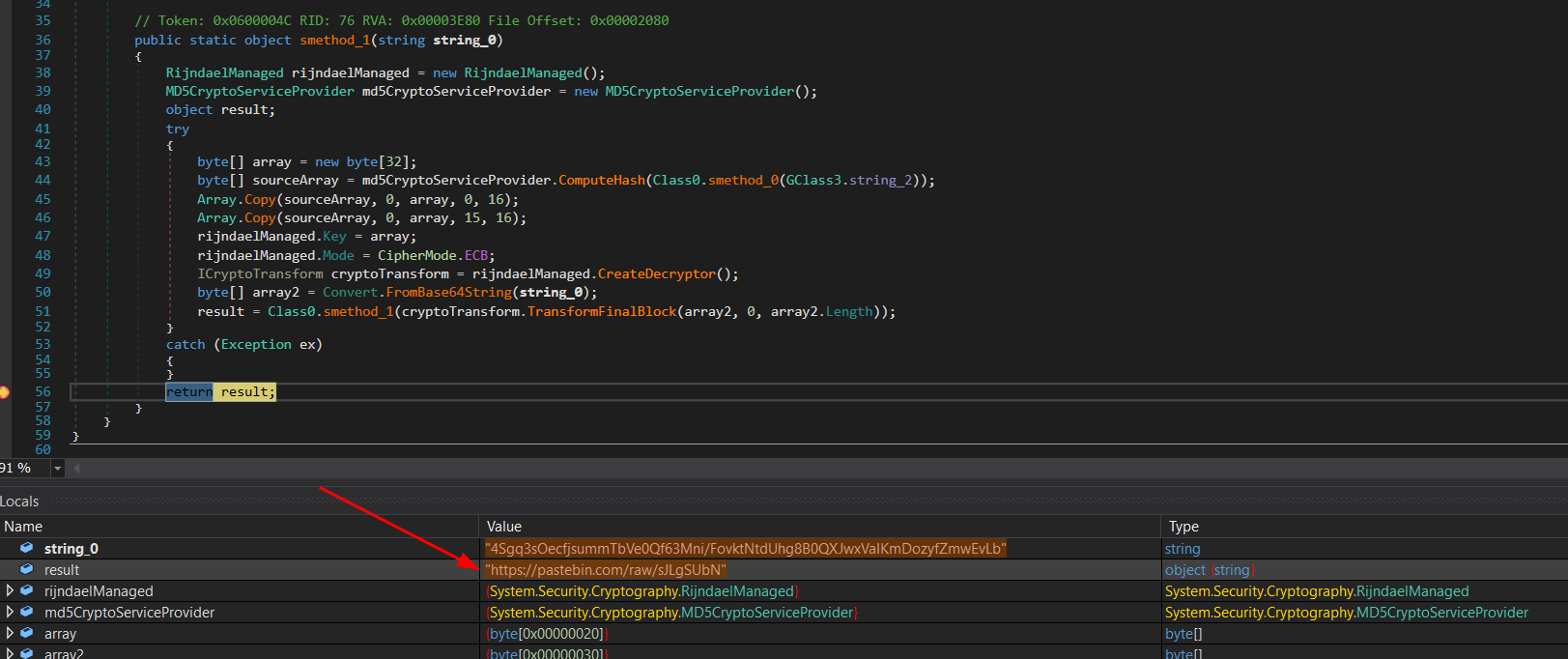 При помощи отладчика достанем расшифрованную строку, которая содержит в себе ссылку на внешний ресурс https://pastebin[.]com/raw/sJLgSUbN.