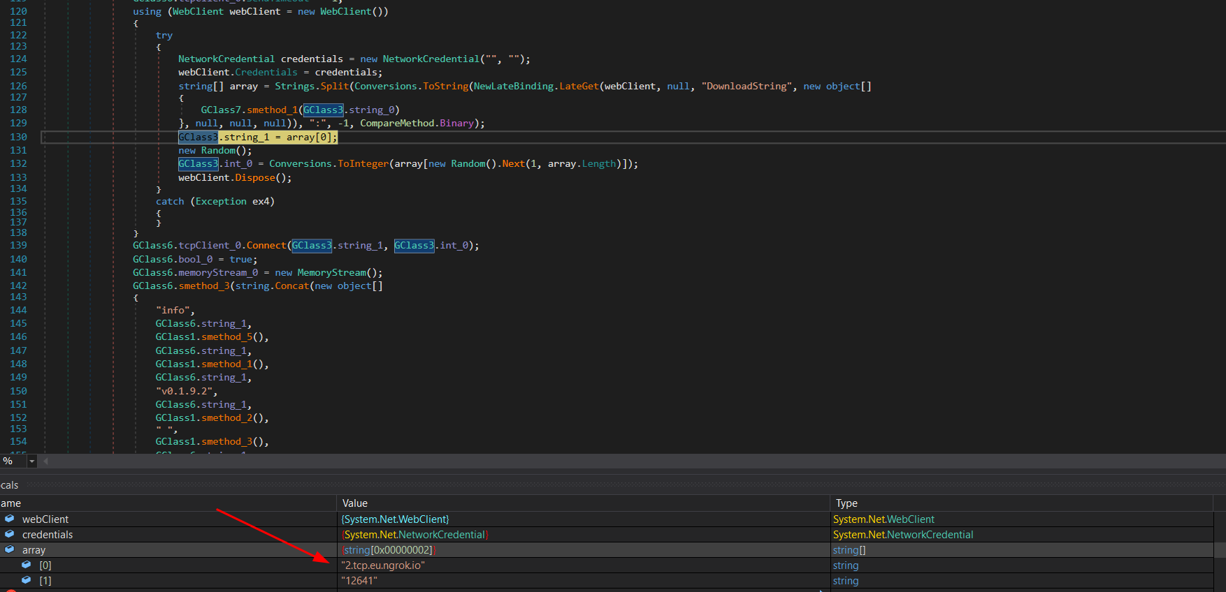 Полученные данные с pastebin используются для установки связи с C2C сервером: