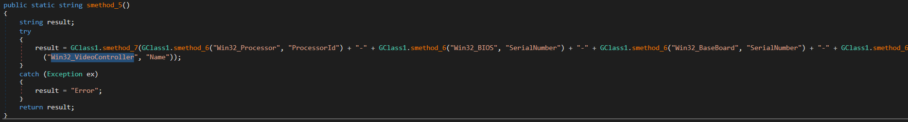 Вызываемый метод использует WMI и собирает следующую информацию: ProcessorId, Bios SerialNumber, BaseBoard SerialNumber, Win32_VideoController Name: