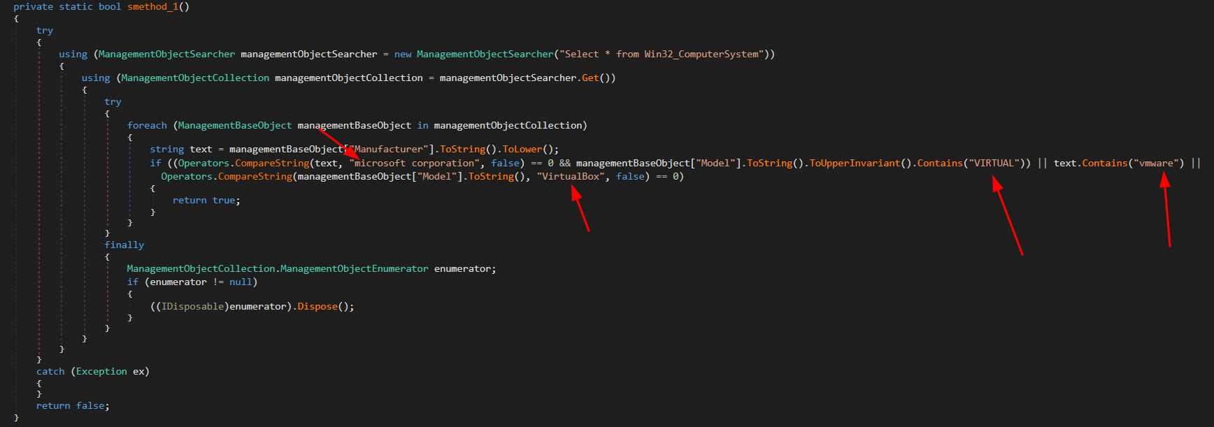 Далее происходит проверка на наличие средств виртуализации, аналогично при помощи WMI производителя и при наличии подстроки с указанием одного из средств виртуализации (vmware, microsoft corporation, Virtual или VirtualBox) возвращает булево значение 1 (1 – обнаружено виртуальное пространство).