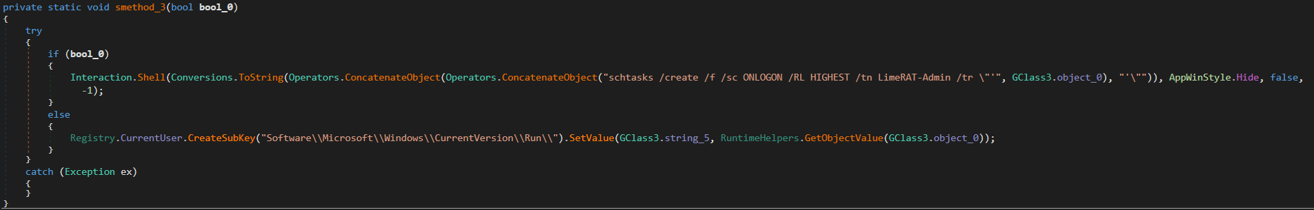 После копирования себя в директорию вредоносное ПО использует инструкции по закреплению себя в автозапуске системы. При наличии прав администратора создается запись в планировщике задач с высоким приоритетом и указывается на созданный файл в директории «%Temp%\\lsass.exe». Если привилегий нет, то создается запись в реестре для автозапуска, где также указывается путь до директории «%Temp%\\lsass.exe».