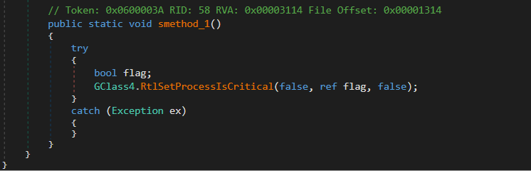 После этого вызывается метод, который импортирует библиотеку «NTdll.dll» и задается текущему запущенному процессу статус «критического процесса», который будет вызывать BSOD при его завершении.