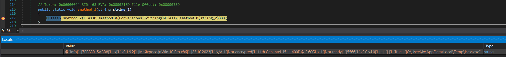 @"info|'L'|7EB83015ABB8|'L'|victim|'L'|v0.1.9.2|'L'|МайкрософтWin 10 Pro x86|'L'|23.10.2023|'L'|N/A|'L'|Not encrypted|'L'|11th Gen Intel i5-11400F @ 2.60GHz|'L'|Not ready|'L'|5566|'L'|v2.0 v4.0|'L'|...|'L'| |'L'|True|'L'|C:\Users\victim\AppData\Local\Temp\lsass.exe"