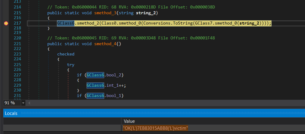 Во время запуска вредоносного ПО он проверяет наличие активного соединения с C2C сервером, после чего отправляет свой статус. В случае первого запуска на машину злоумышленника отправляется подробные сведения о машине жертвы, а именно: имя пользователя, версия сборки ВПО, наличие антивирусного ПО, состояние системы (зашифрована/нет), версия процессора, порт для коммуникации, версия dotnet framework и путь, по которому было установлено ВПО. При этом используют в качестве разделителей категории данных символы: «|'L'|».