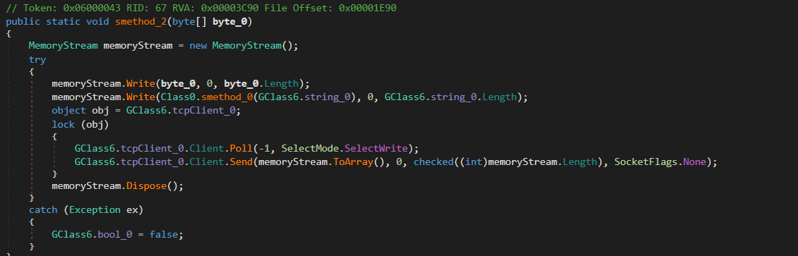 Отправка пакетов от жертвы злоумышленнику происходит при помощи tcp соединения. В метод «smethod_2» в качестве аргумента передается массив байтов, который шифруется и отправляется:
