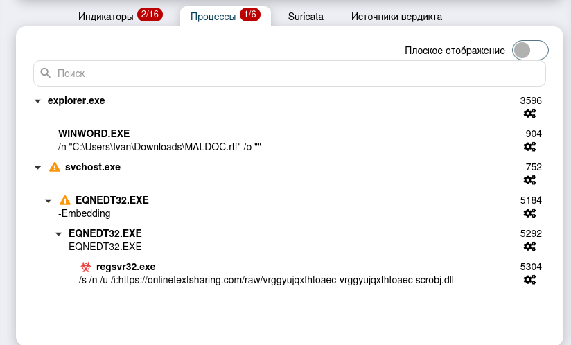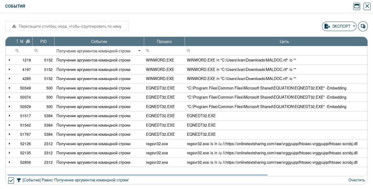В блоке «События» можно заметить записи «Получение аргументов командной строки». Вирус эксплуатирует CVE-2017-11882 (уязвимость в редакторе уравнений из пакета Microsoft Office, связана она с ошибкой обращения с объектами в оперативной памяти), он «плодит» eqnedt32.exe. Данный процесс позволяет выполнить на уязвимом устройстве произвольный код без взаимодействия с пользователем.