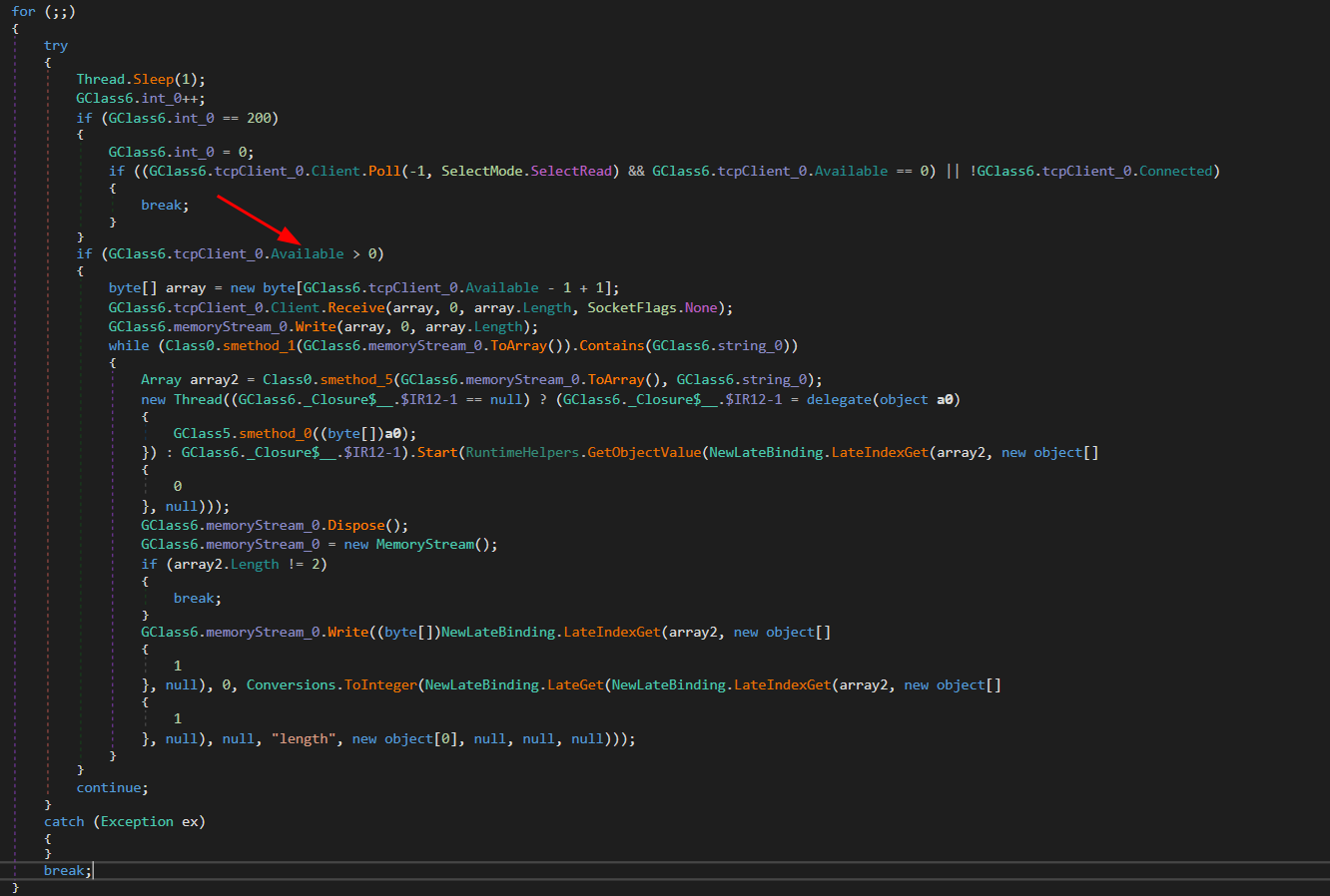 Также ВПО постоянно проверяет количество полученных и доступных для чтения байтов. Это используется для того, чтобы передавать файлы на машину жертвы: