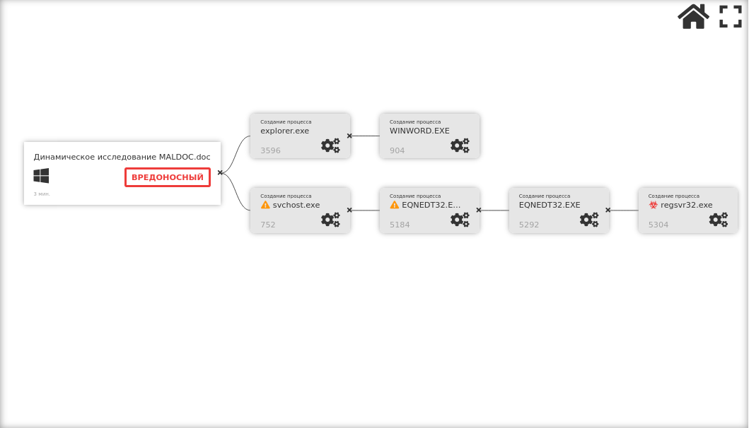 Среди системных программ, выявленных в процессе динамического исследования, были обнаружены такие как: svchost.exe, eqnedt32.exe и regsvr32.exe.