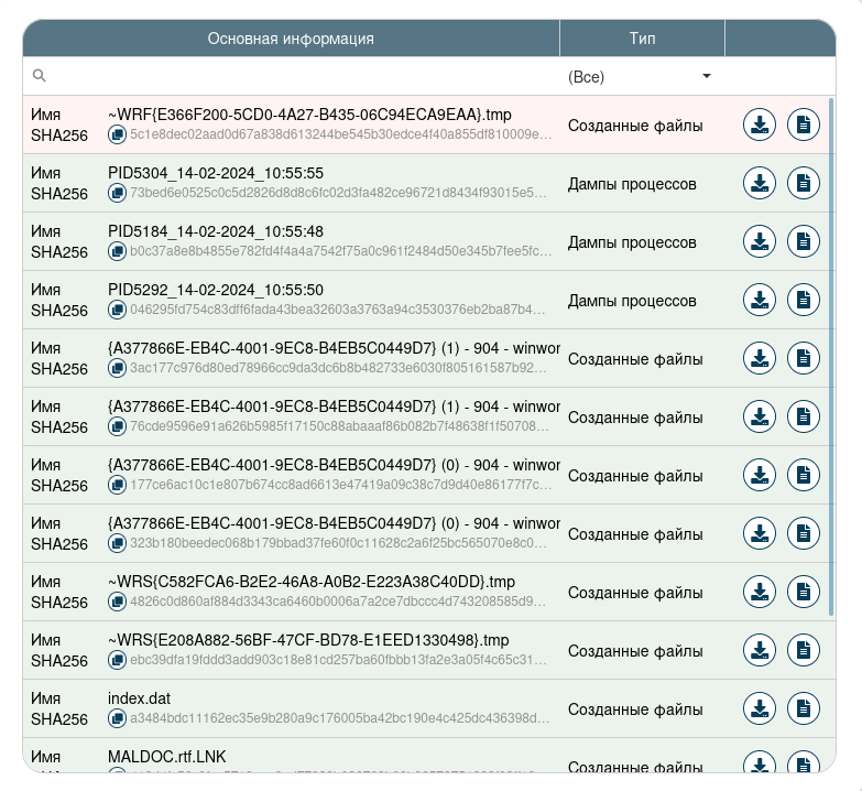 В блоке «Дампы» видно, что ПО во время работы создало файл с расширением TMP. Злоумышленники могут использовать файлы с расширением TMP для распространения вирусов и вредоносных программ путем изменения содержимого файла.