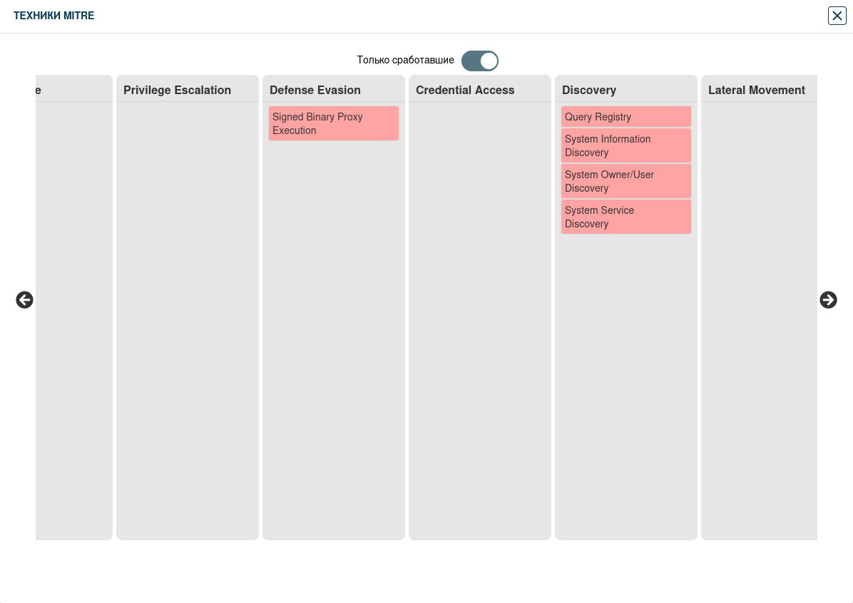 Во вкладке «Техники MITRE» видно, что отработало несколько техник: