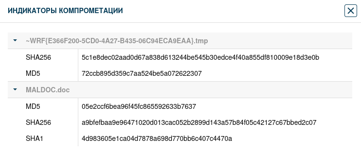 Во вкладке «Индикаторы компрометации» отображаются индикаторы компрометации вредоносного поведения файла по результатам его проверки в «песочнице».