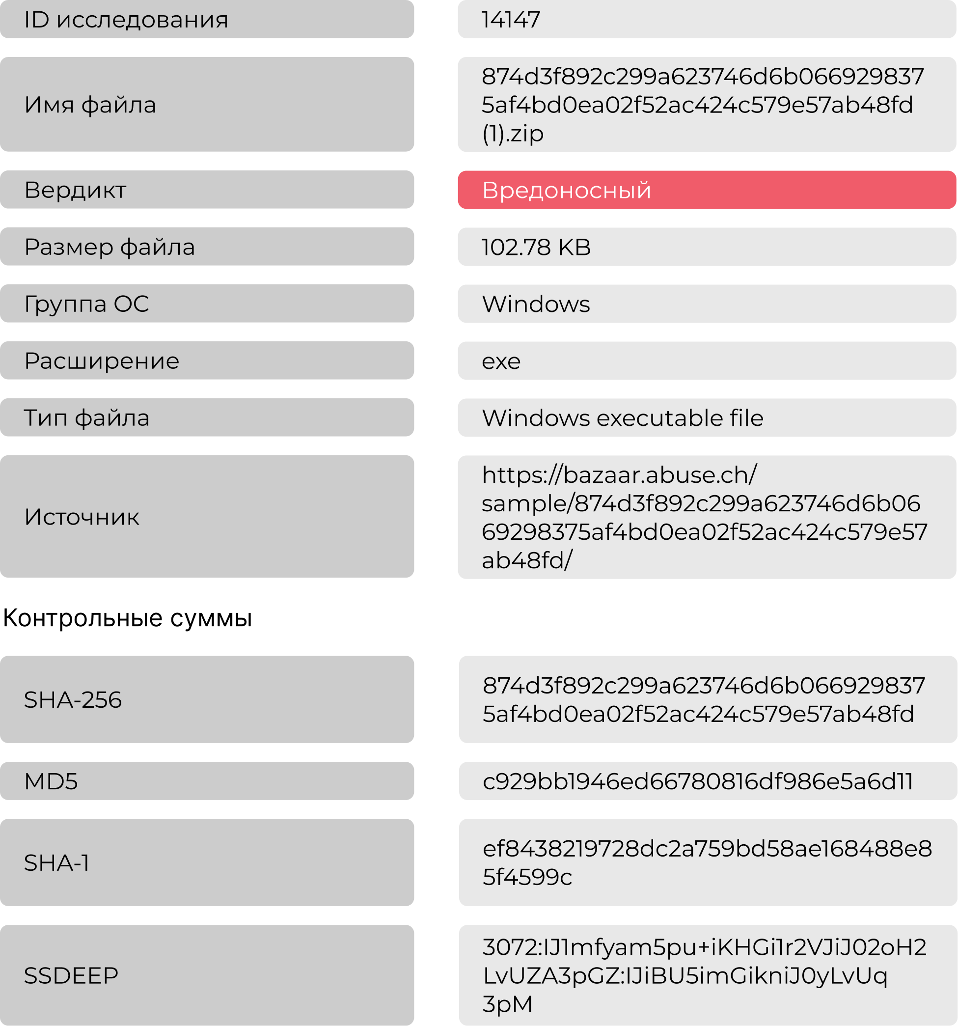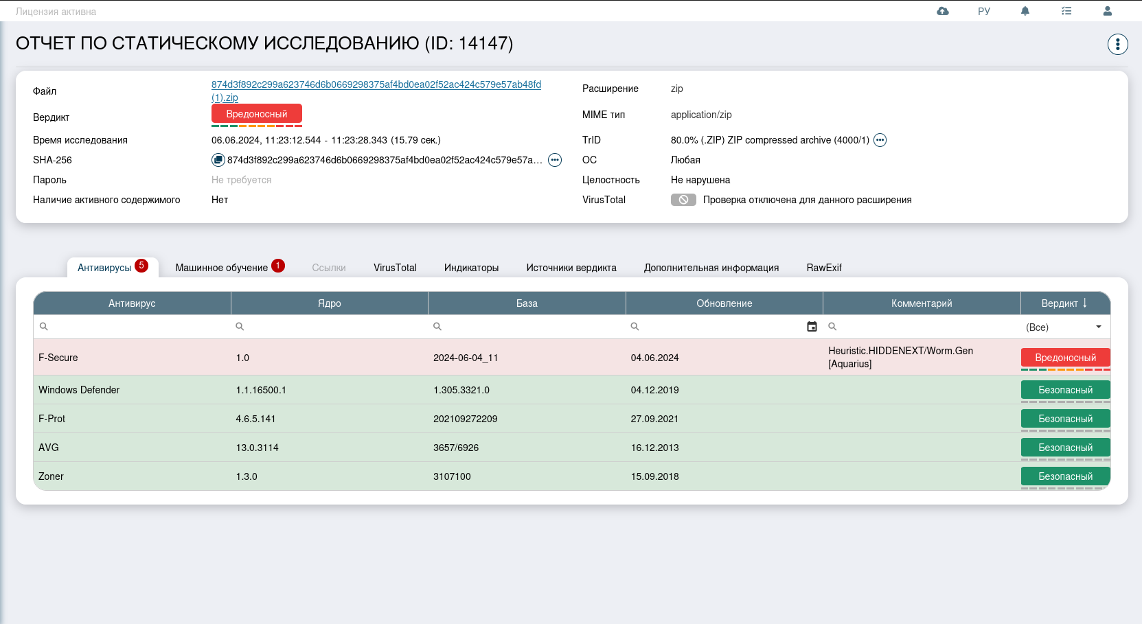 Модуль машинного обучения также выдал вредоносный вердикт, указав теги: trojan, adware и miner.