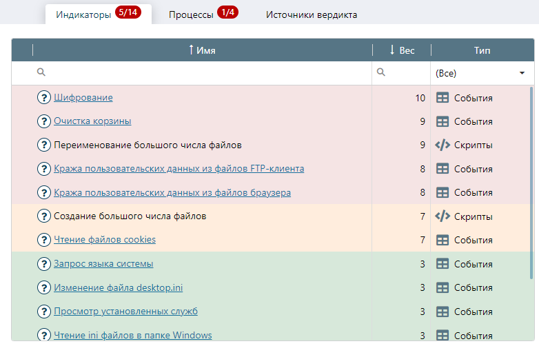 Вредоносные и подозрительные индикаторы динамического анализа, зафиксированные в процессе анализа, представлены в таблице 2: