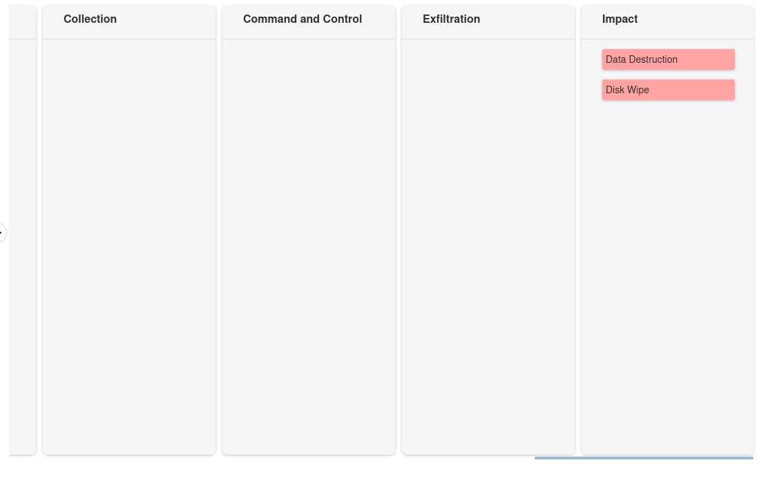 - Data Destruction - злоумышленники уничтожают данные и файлы в системах или в сети, чтобы прервать доступность систем, служб и сетевых ресурсов. Злоумышленники могут перезаписать файлы и каталоги произвольно сгенерированными данными, чтобы сделать их безвозвратными. Вредоносное ПО, предназначенное для уничтожения данных, может иметь черве-подобные функции для распространения по сети с использованием дополнительных методов, таких как действительные учетные записи, сброс учетных данных ОС и проч.