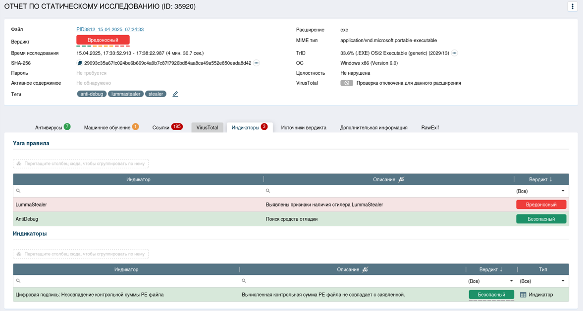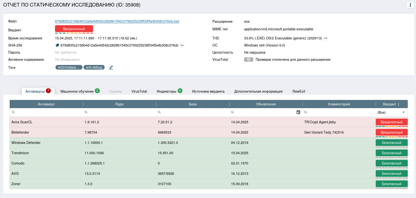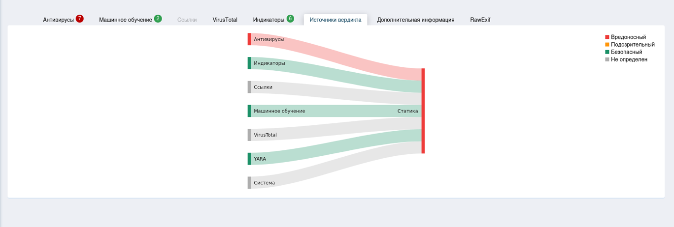 С вкладкой «Источники вердикта» стоит просто ознакомиться, она несет в себе информацию о том, какие методы и модули статического анализа выдали вердикт после проверки данного файла.