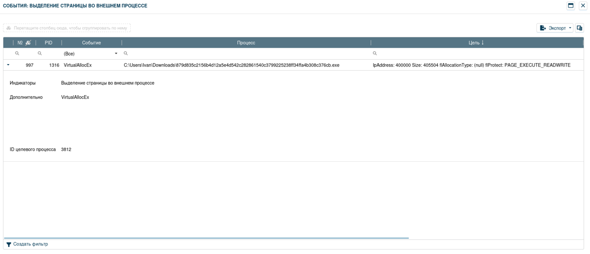 1) индикатор «Запись в память системного процесса» - запись в память системного процесса используется вредоносным ПО для исполнения своего кода от имени системного процесса;