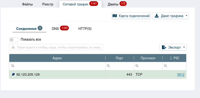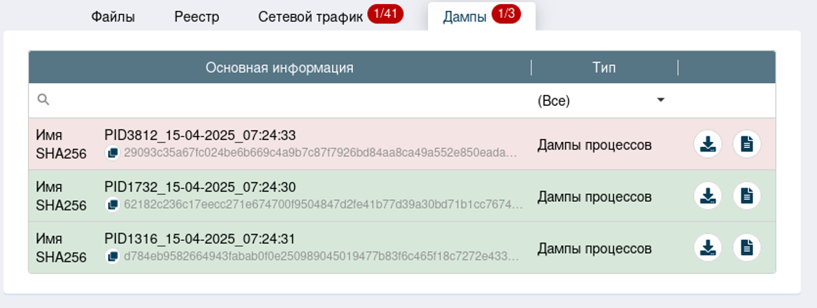 Код из данной секции записывается в память системного процесса (Рисунок 10). В системе были сформированы дампы данных процессов, которые отобразились во вкладке «Дампы» (Рисунок 11).