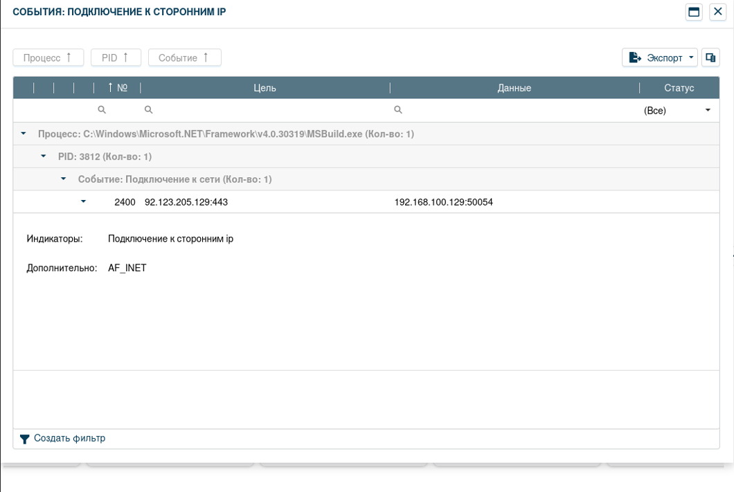2) индикатор «Компиляция и запуск кода при помощи системной программы msbuild» - ПО использует системную программу msbuild (Microsoft Build Engine) для компиляции и запуска C# кода в обход AppLocker. Данное поведение свойственно вредоносному ПО;