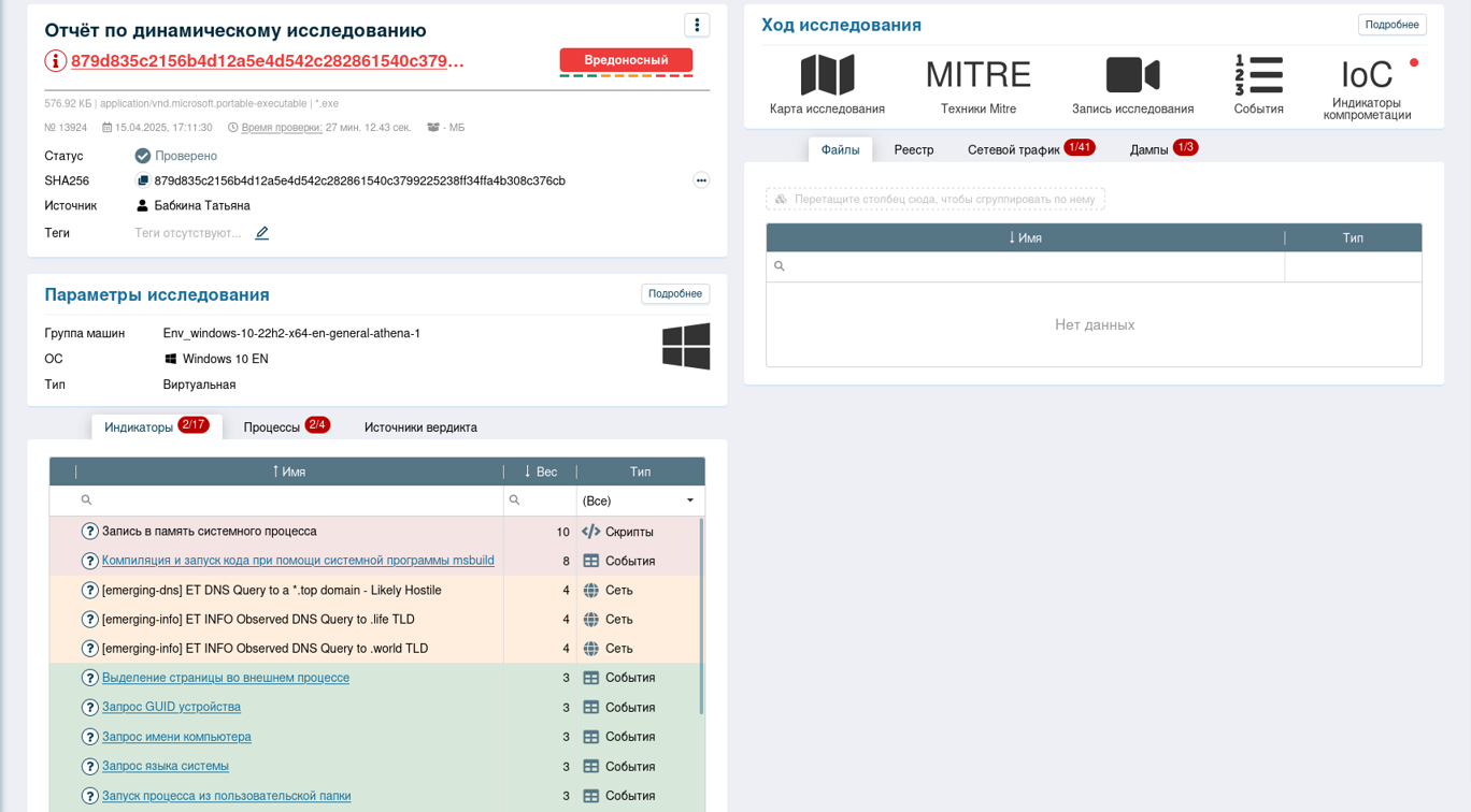 При динамическом анализе в системе ATHENA сработало несколько индикаторов: