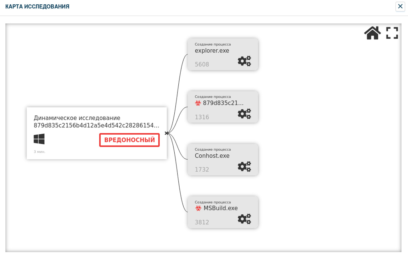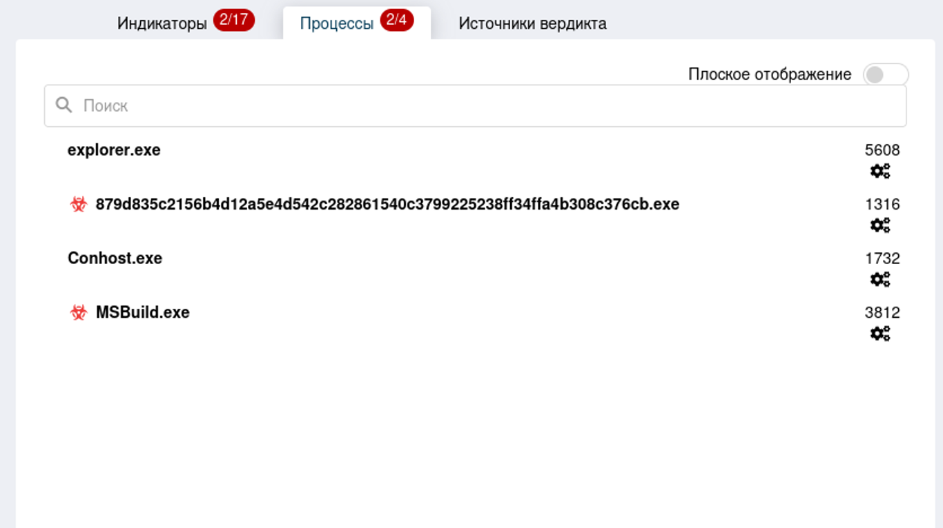 В ходе динамического анализа среди системных программ были обнаружены explorer.exe, Conhost.exe, MSBuild.exe.