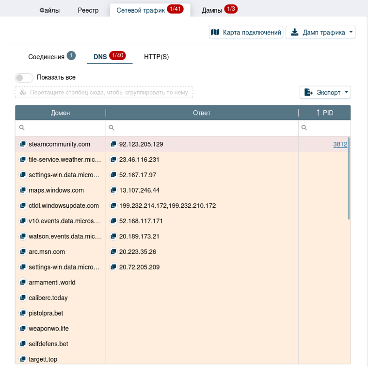 Во вкладке «Сетевой трафик» видим, что были обнаружены вредоносные ссылки. Кроме того, файл использует Dead Drop Resolver, при котором адреса C2 серверов хранятся в описаниях профилей Steam, что затрудняет блокировку и обнаружение инфраструктуры злоумышленников. Попытку подключения к API площадке Steam видно в подразделе «Соединения» (Рисунок 7).