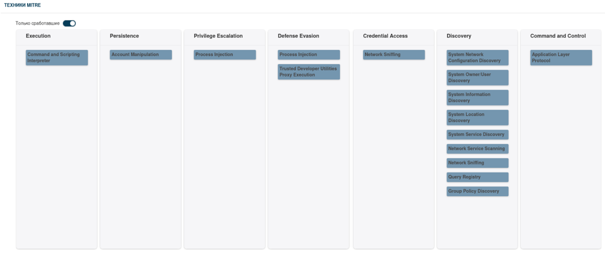 Во вкладке «Техники MITRE» видно, что отработало несколько техник.