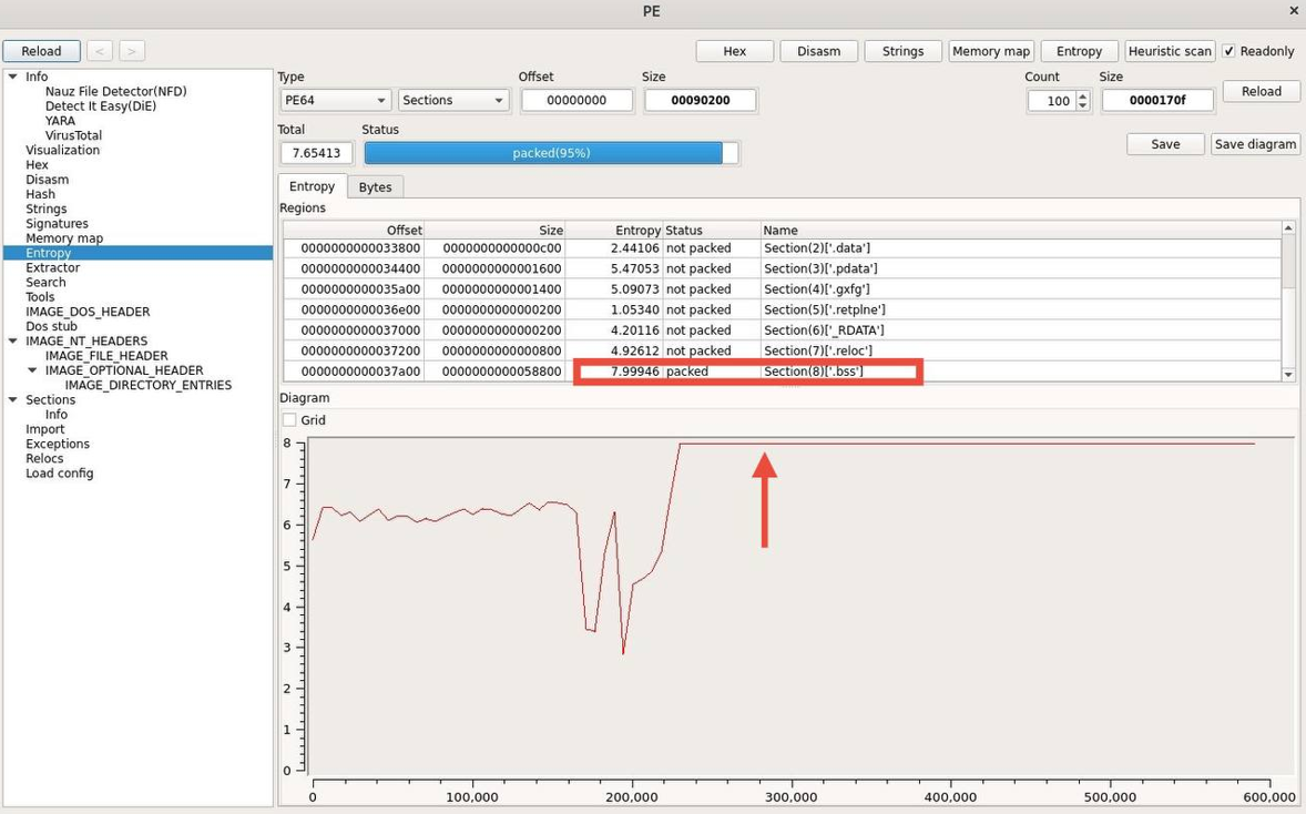 Проверка энтропии файла в программе Detect It Easy показывает, что .BSS раздел имеет высокую энтропию. Этот раздел обычно содержит неинициализированные глобальные и статические объекты, поэтому высокая энтропия может указывать на то, что он содержит дополнительную полезную нагрузку.