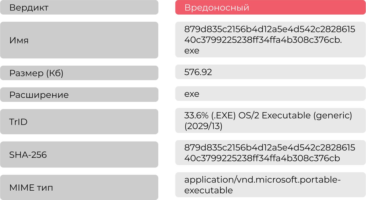 На анализ в систему ATHENA пришел исполняемый файл с расширением .exe. Для начала была собрана его общая информация, представленная в таблице Таблица 1.
