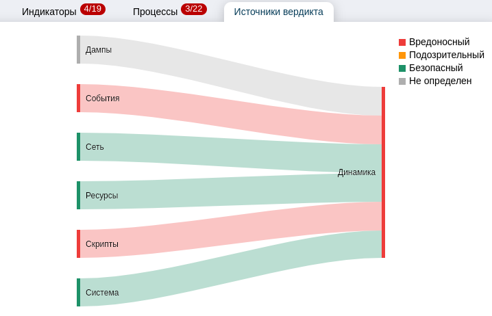 Вкладка «Источники вердикта» показывают все источники (статические и динамические), которые сработали и вынесли вердикт.