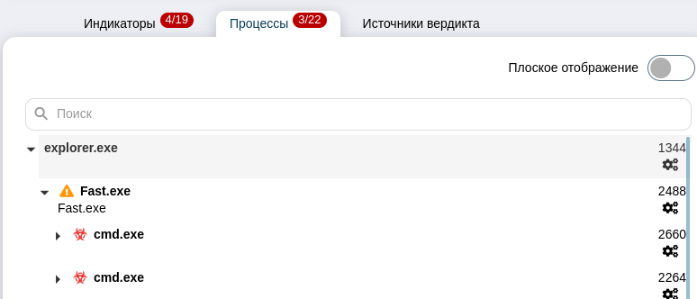 Среди системных программ, выявленных в процессе динамического исследования, были выявлены такие как: explorer.exe и Fast.exe (сам файл)