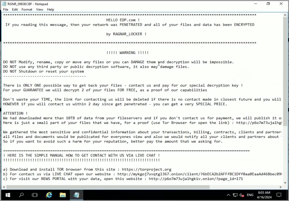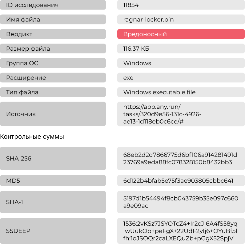 Данное программное обеспечение шифрует данные крупных компаний и бизнес-пользователей с помощью AES + RSA-2048, а затем требует выкуп в ~20-60 BTC, чтобы вернуть файлы. Оригинальное название: RagnarLocker или Ragnar_Locker.