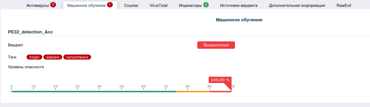 Модуль машинного обучения также выдал вредоносный вердикт. Присвоены теги «Trojan», «Adware», «Ransomware»