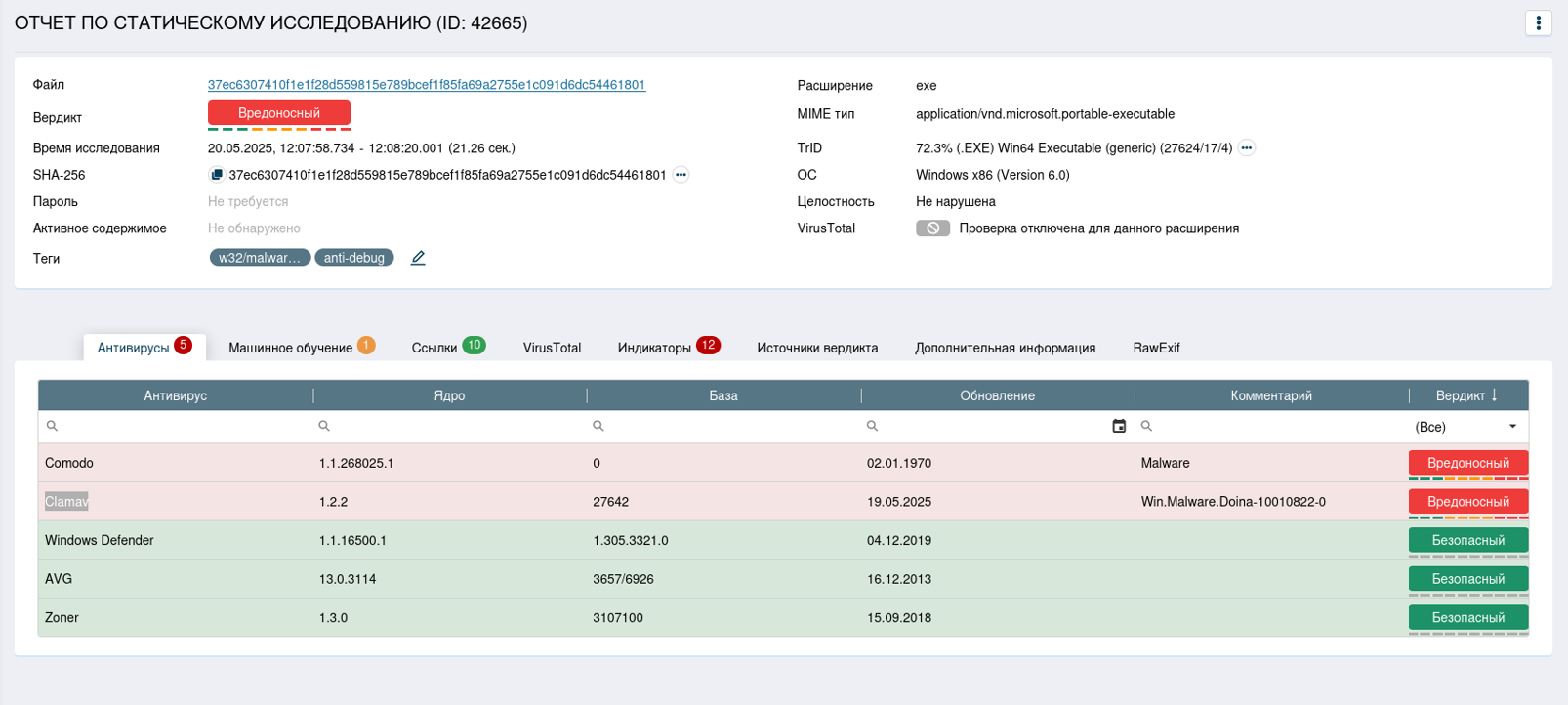 С вкладкой «Источники вердикта» стоит просто ознакомиться, она несет в себе информацию о том, какие методы и модули статического анализа выдали вердикт после проверки данного файла.