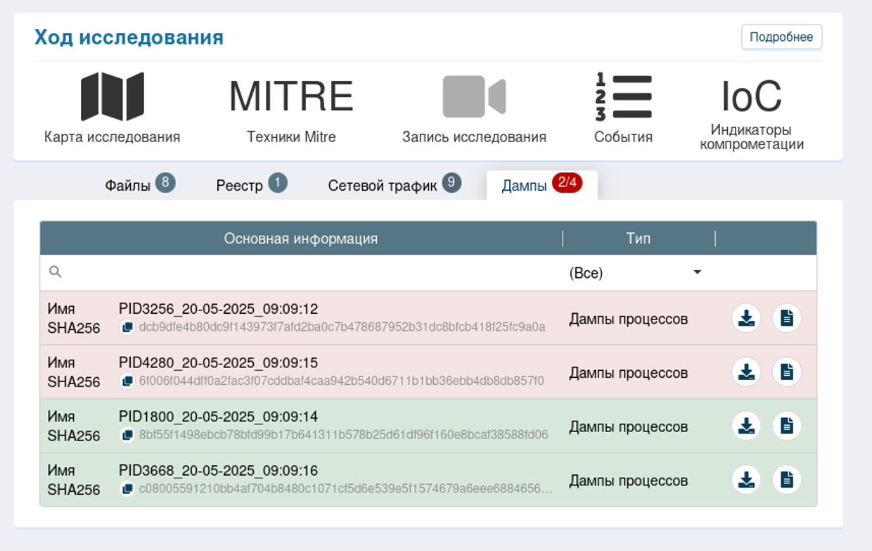 Во вкладке «Дампы» видим, что были обнаружены вредоносные дампы процессов.