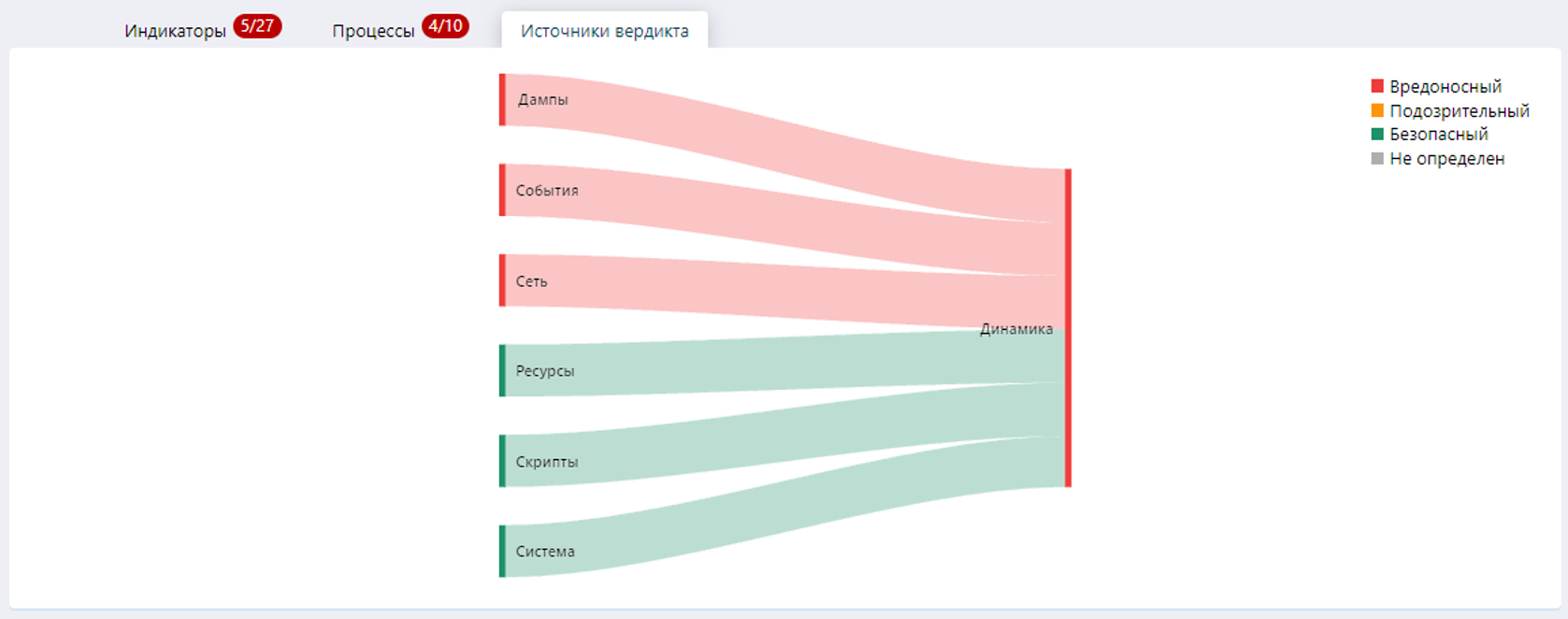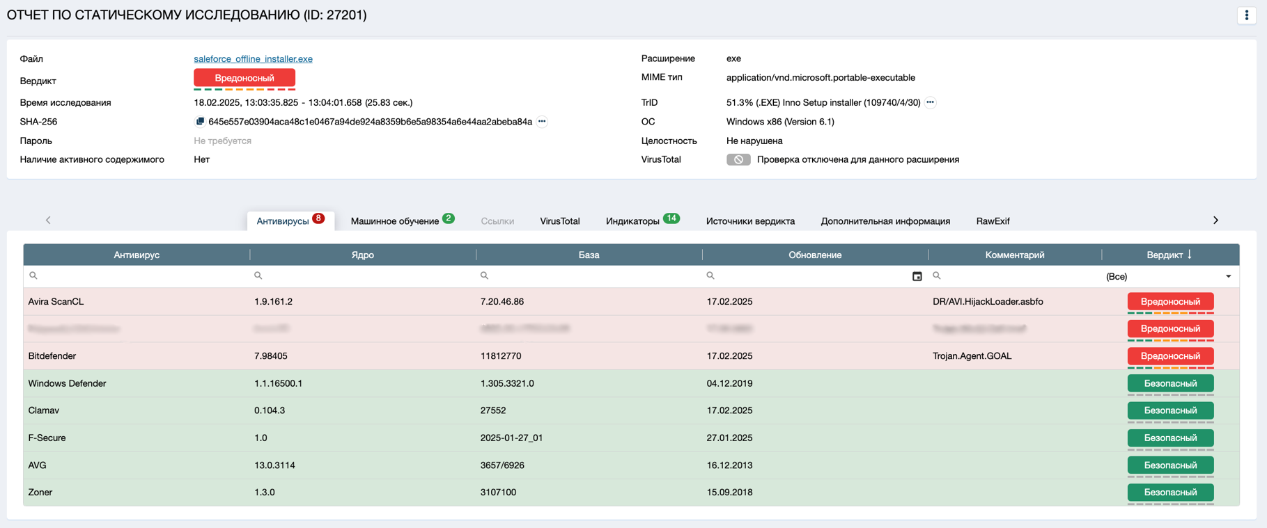 Во вкладке «Источники вердикта» можно ознакомиться с тем, какие источники посчитали файл вредоносным.