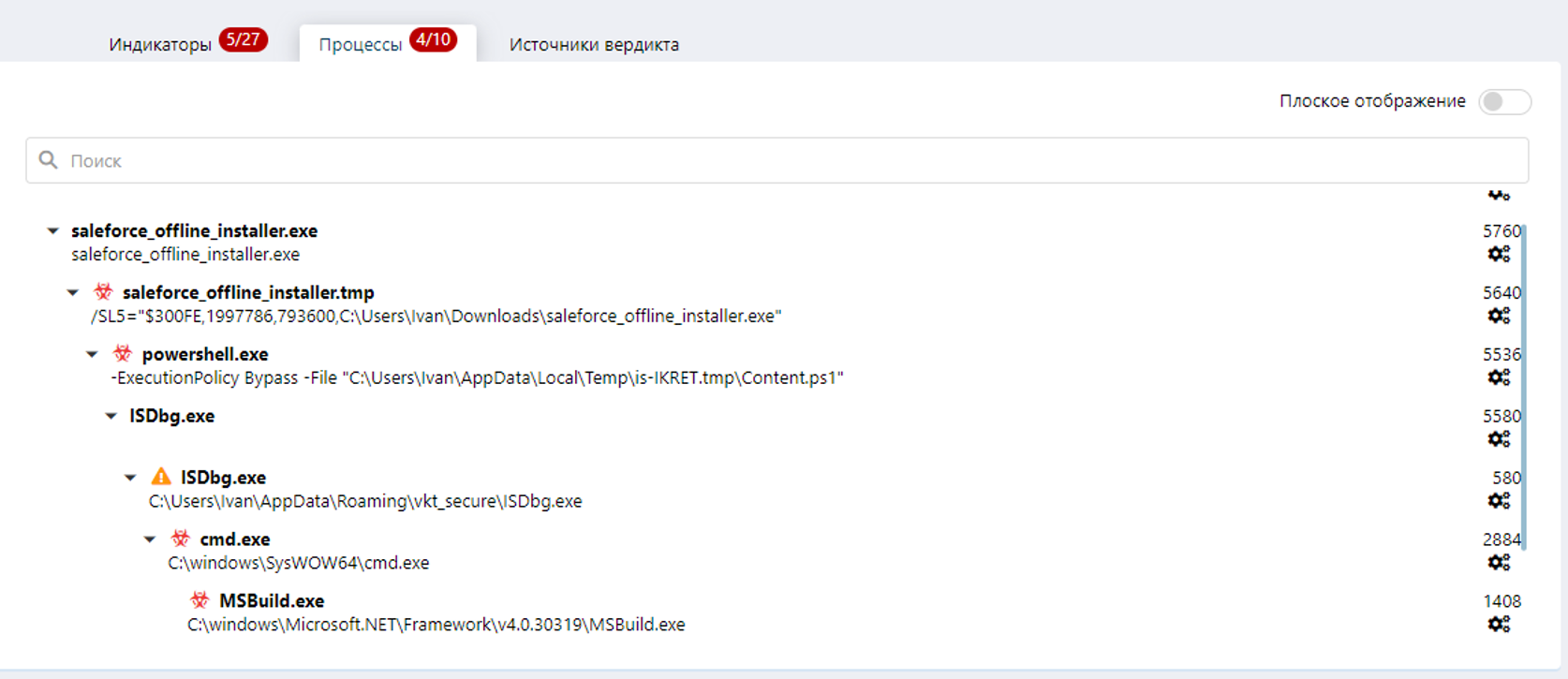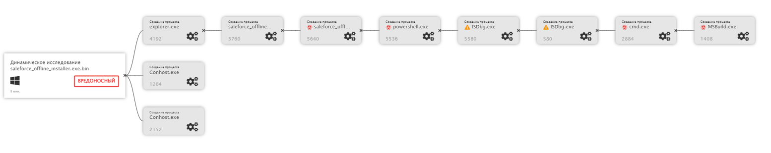 Все созданные процессы отображаются во вкладке «Процессы», в том числе, видно, что «saleforce_offline_installer.exe» создал и запустил процесс «powershell» и передал в качестве аргумента