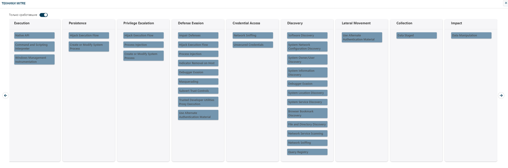 В окне «Техники MITRE» отображаются, какие тактики и техники задействованы для заражения устройства вредоносным ПО: