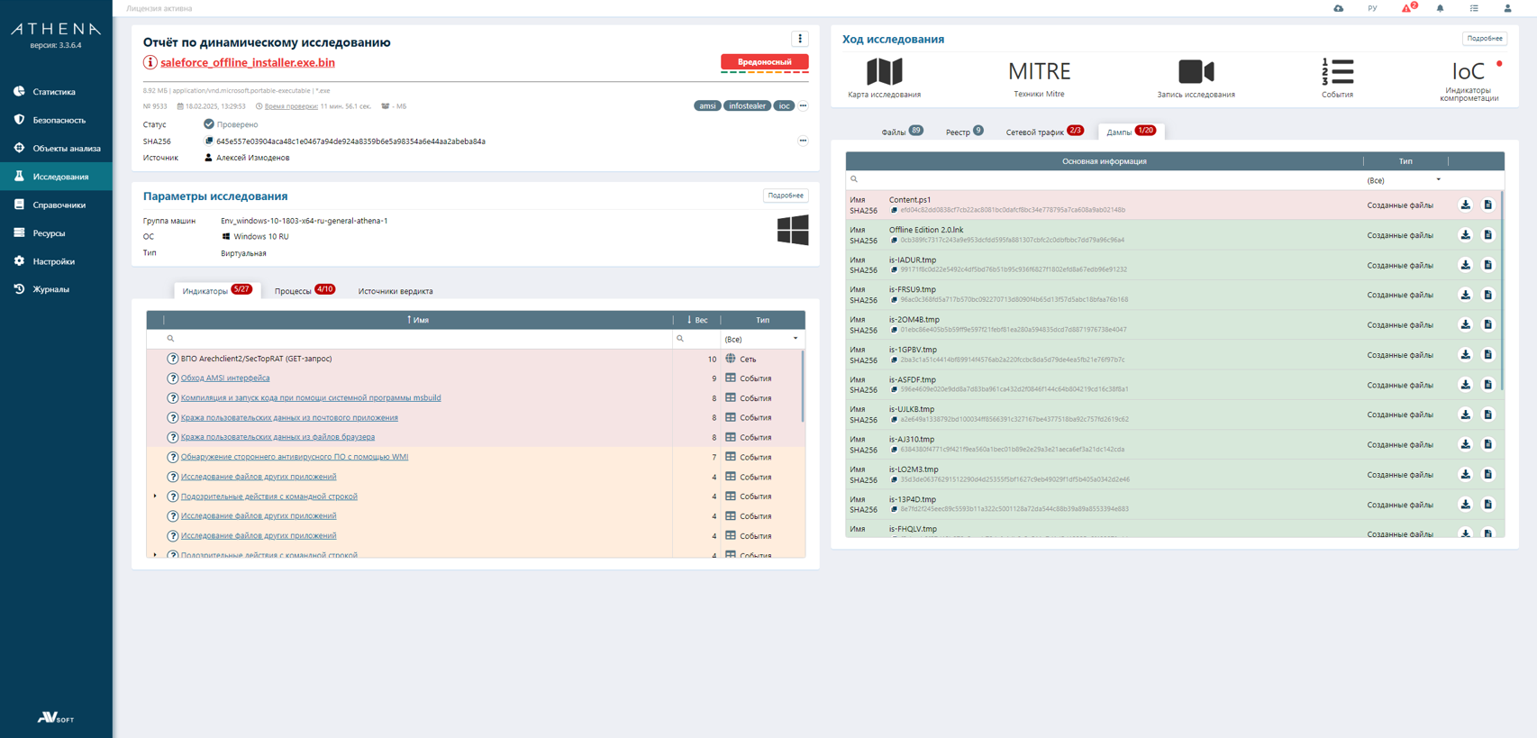 Динамический анализ в системе ATHENA выявил несколько вредоносных индикаторов: