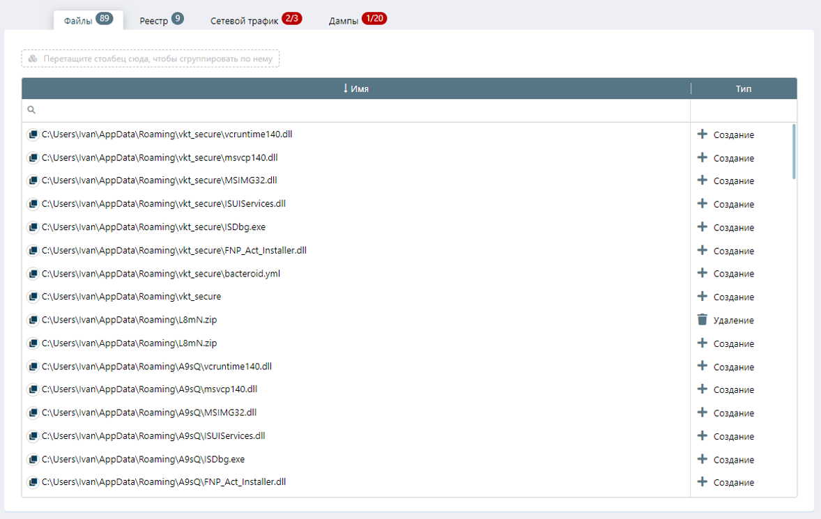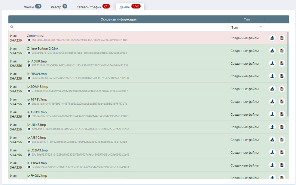 Во вкладке «Дампы» отображаются создаваемые файлы и дампы процессов, которые были получены в ходе исследования. Видим, что была создана инструкция для powershell – «Conrent.ps1», которая после статического исследования получила вердикт «Вредоносный».