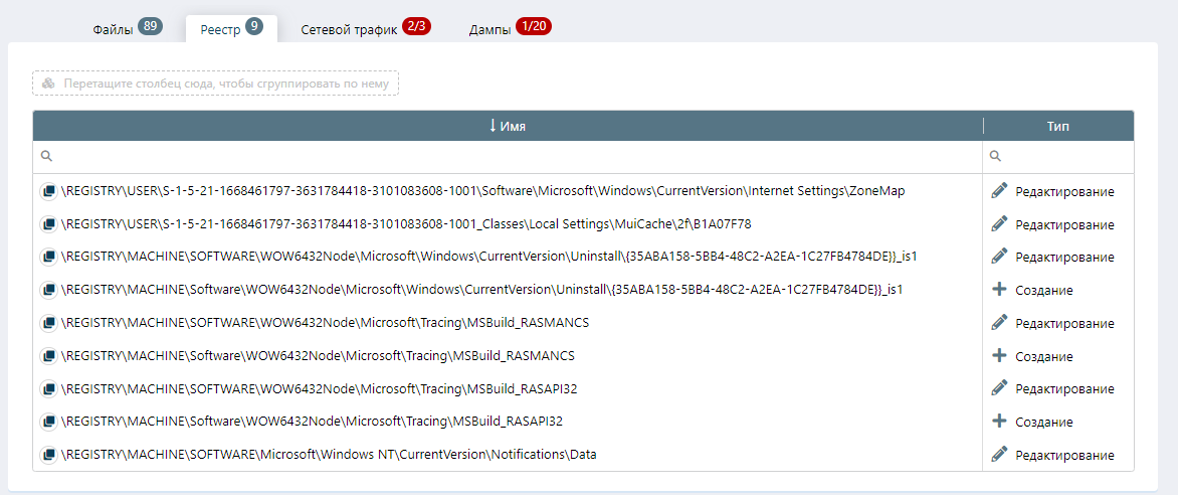 Во вкладке «Файлы» отображаются все созданные, отредактированные записи в реестре системы: